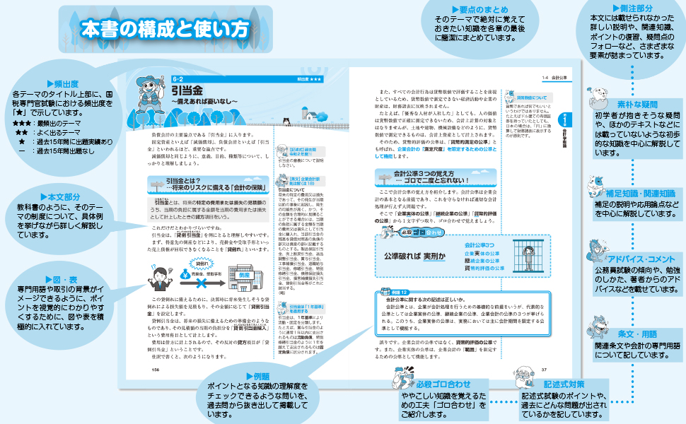 豊富な図解と具体例でやさしく解説し、難解な会計用語も繰り返し説明することで確実な定着を図ります。実際の取引や国税実務を取り上げることで、会計の流れを「見てわかる」構成にしました。さらに、過去問分析に基づいて頻出テーマを厳選。記述式試験対策とあわせて、効率的に合格レベルへ到達できます。