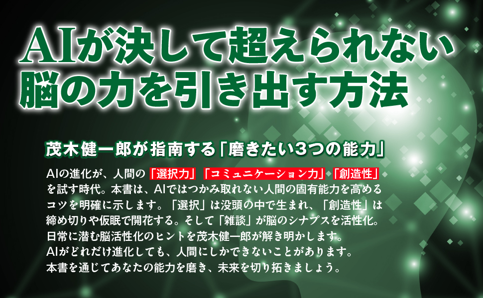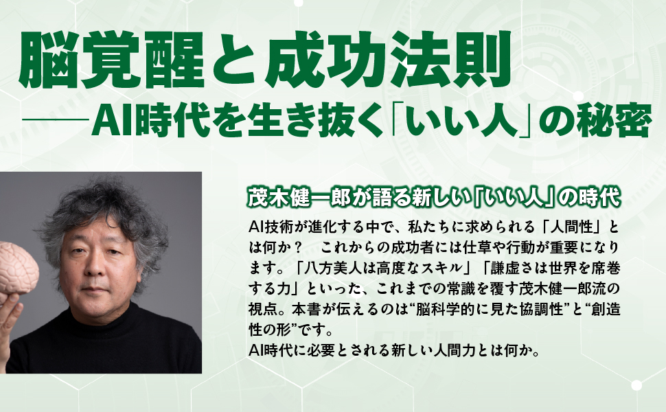 世界の研究者と議論を重ねる英語圏のAI最先端サークルでも、日本的価値観と日本人の役割が話題になっている。一方で、日本は研究者の数も予算も世界から周回遅れの現状。それでも、国、会社、学校、社会…すべてのシステムが圧倒的な変化を余儀なくされていく。対応できなければ取り残される時代。逆に言えば一歩抜け出すことができれば、成功の可能性は飛躍的に高まる。AIと脳科学の最先端研究に接する脳科学者・茂木健一郎が、無知を超え、脳を覚醒させ、自身を劇的にアップデートさせる方法を解説する。